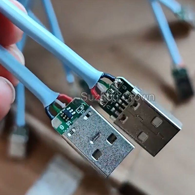 Quality testing of USB cables before packaging.