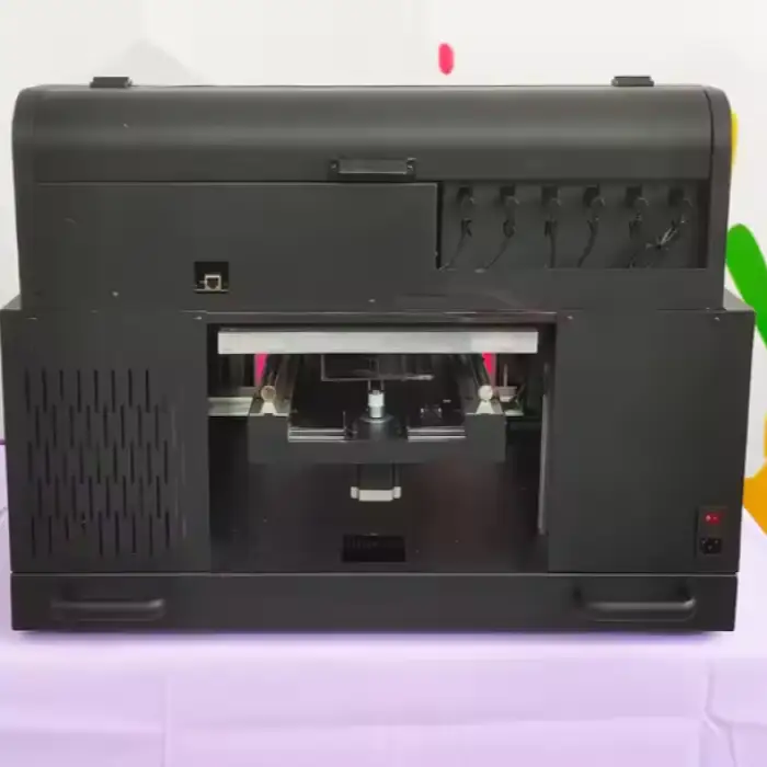 The printer uses a combination of CMYK, white, and varnish inks, delivering vibrant, durable, and high-quality prints.