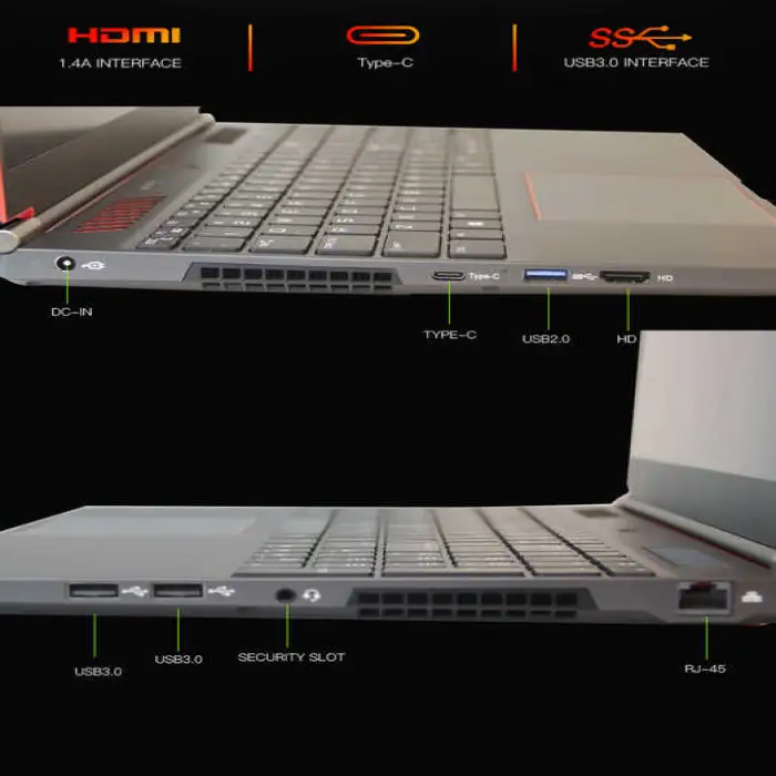 It includes multiple interfaces: DC, Type-C, USB, HDMI, and RJ45 for versatile connectivity.