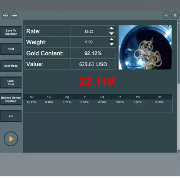 This machine can test a variety of metals, including gold (Au), silver (Ag), copper (Cu), platinum (Pt), palladium (Pd), and more.
