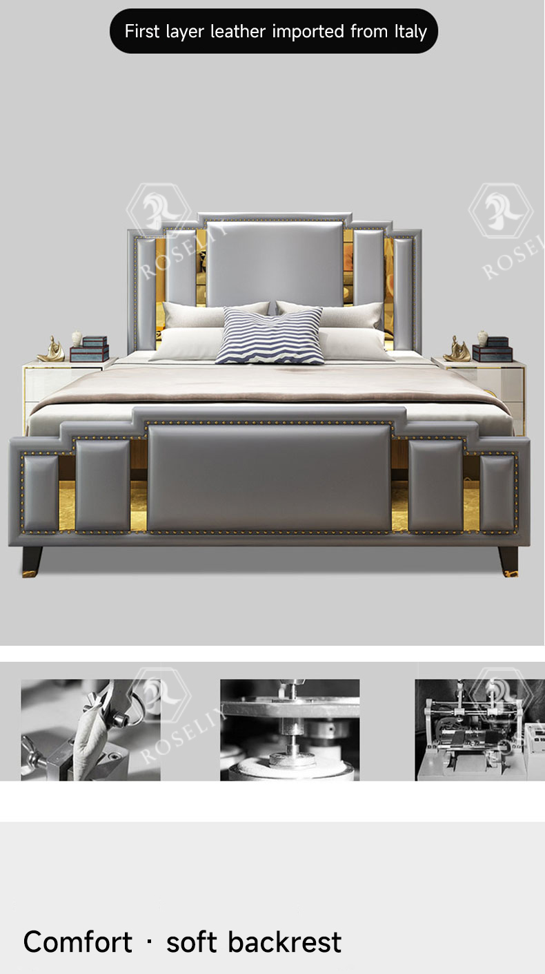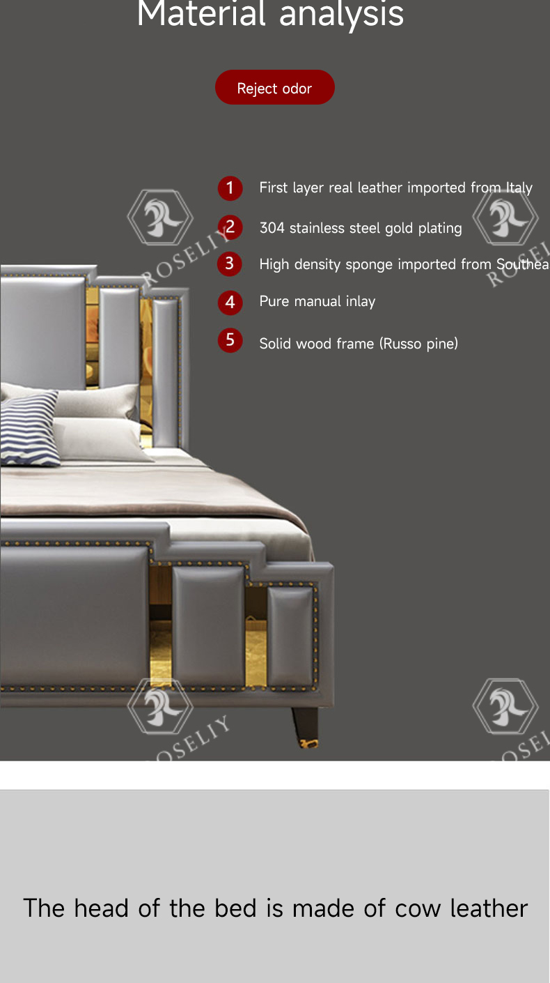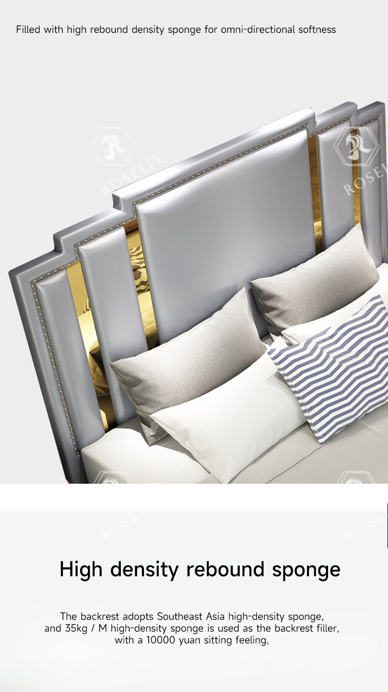 The headboard is constructed using genuine leather, foam, wood, and a gold stainless steel frame.