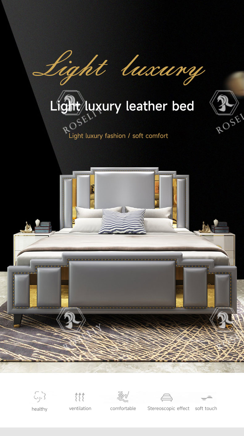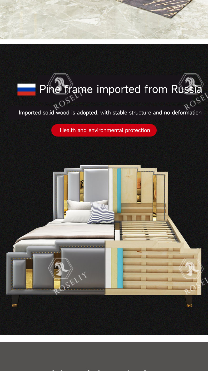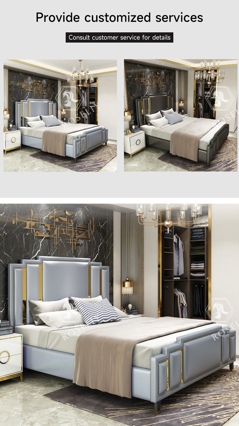 The headboard is constructed using genuine leather, foam, wood, and a gold stainless steel frame.