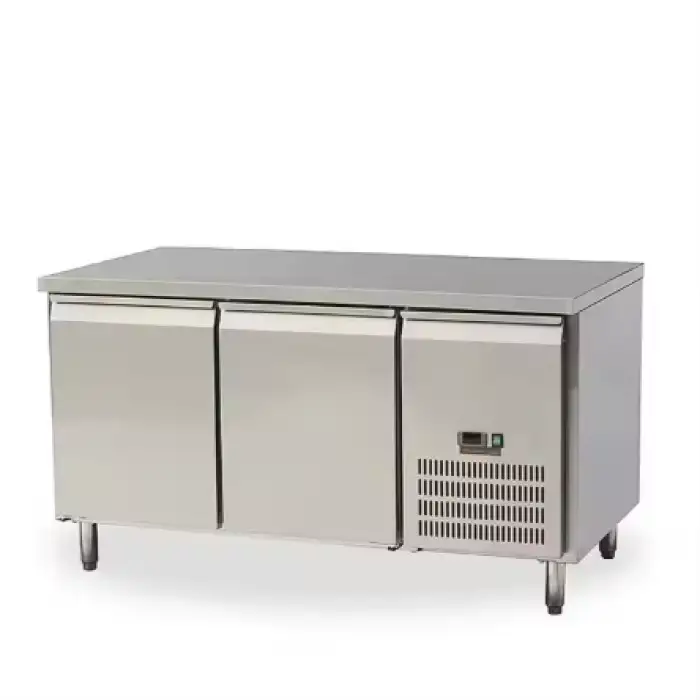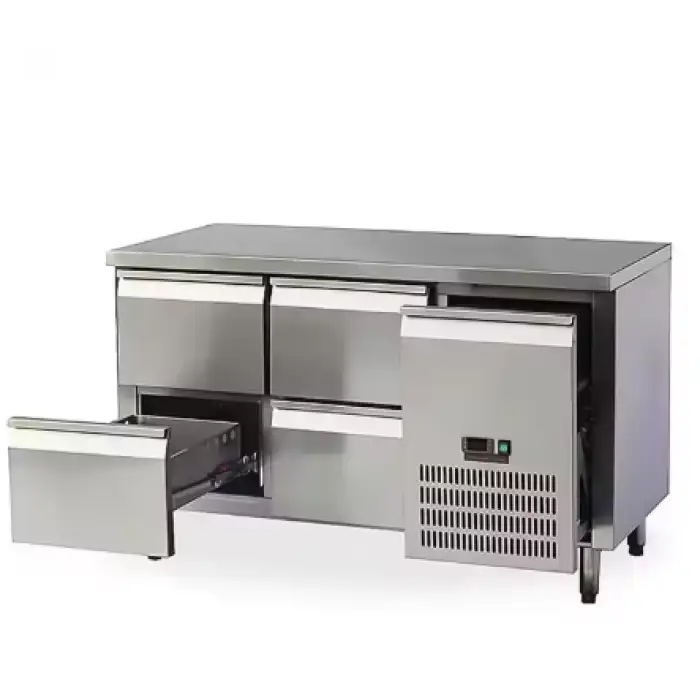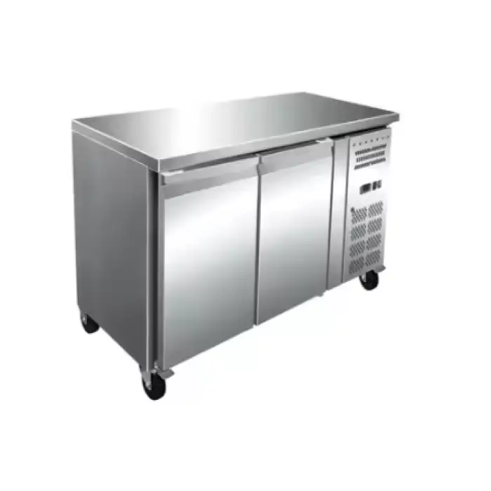 This unit is an undercounter commercial refrigerator worktable designed to keep drinks and ingredients cool while providing a durable stainless steel work surface for restaurants, cafes, bars, catering services, bakeries, food trucks and other commercial kitchens.