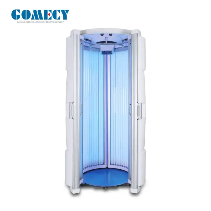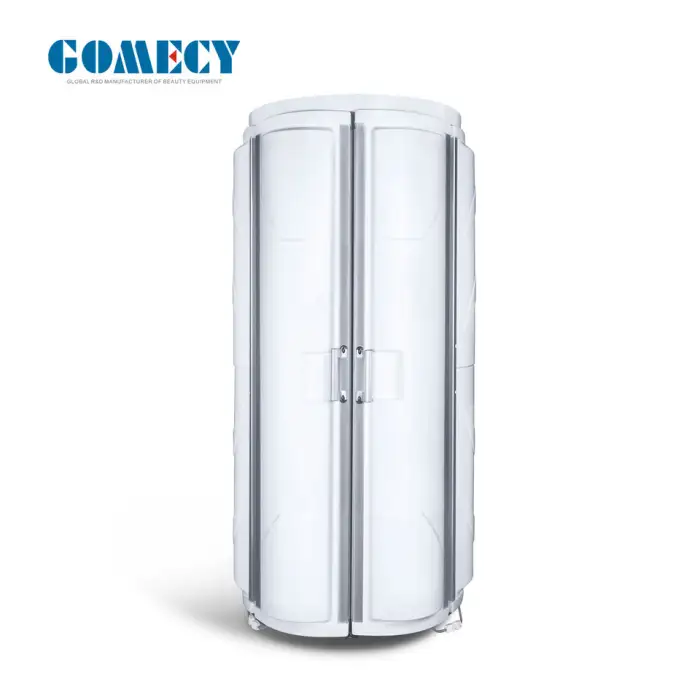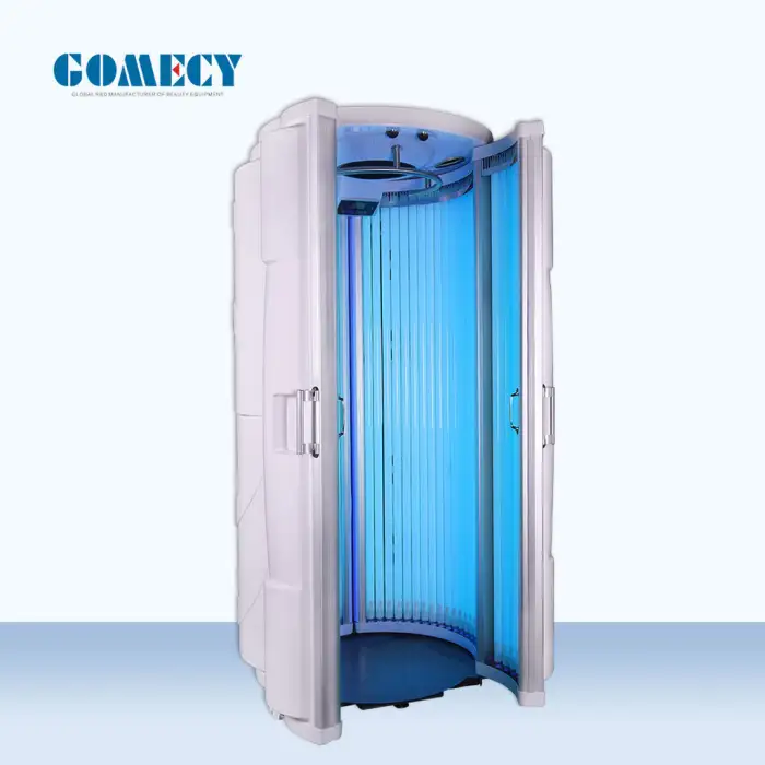The GOMECY Solarium Collagen Tanning Bed (model GMS-6) is a vertical, commercial-grade tanning unit that combines tanning lamps with collagen-focused skin-care technology to deliver an indoor sun-kissed glow while aiming to support skin appearance. It's designed for salons, spas, clinics and also for private indoor tanning rooms.