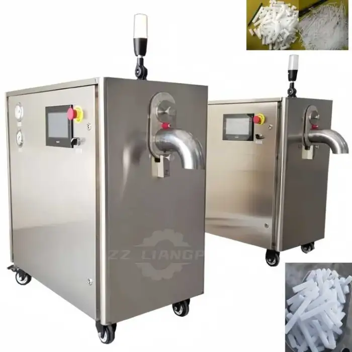 This machine can produce dry ice in sizes of 3mm and 16mm.