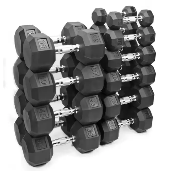 The Gym Fitness Rubber Hex Dumbbell Set includes a variety of weights ranging from 5 to 50 pounds.