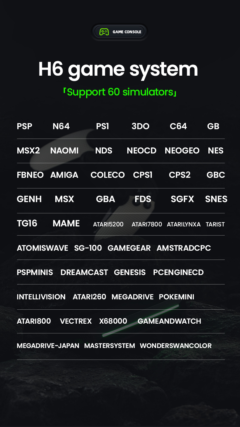 The H6 supports a wide range of classic formats and emulators including CPS, PS1, N64, MAME, NDS, Dreamcast (DC), FC, GB, GBA, GBC, MD (Genesis/Mega Drive), SFC (SNES), Atari, NES and more. Support may vary by game and emulator.