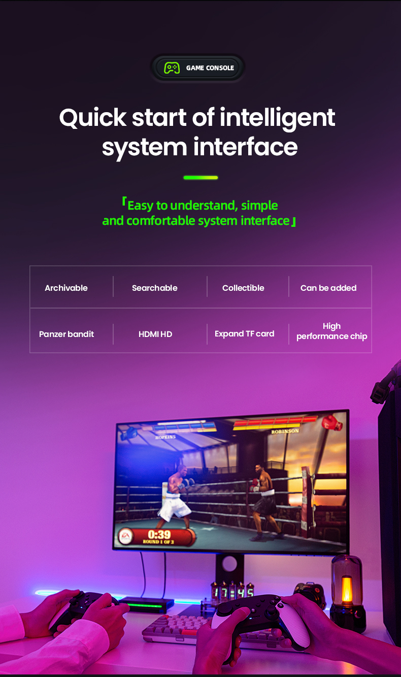 Setup is straightforward: connect the H6 to your TV using the HDMI cable, attach the power adapter, turn on the console, and power on the controllers (they should auto-connect). Use the on-screen menu to browse and launch games.