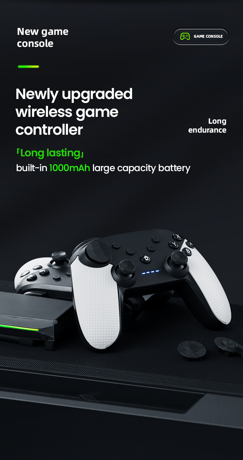 The included controllers use a 2.4GHz wireless connection designed for low latency. They are plug-and-play with the console (pre-paired in most cases). For best performance, keep a clear line-of-sight between controllers and console.