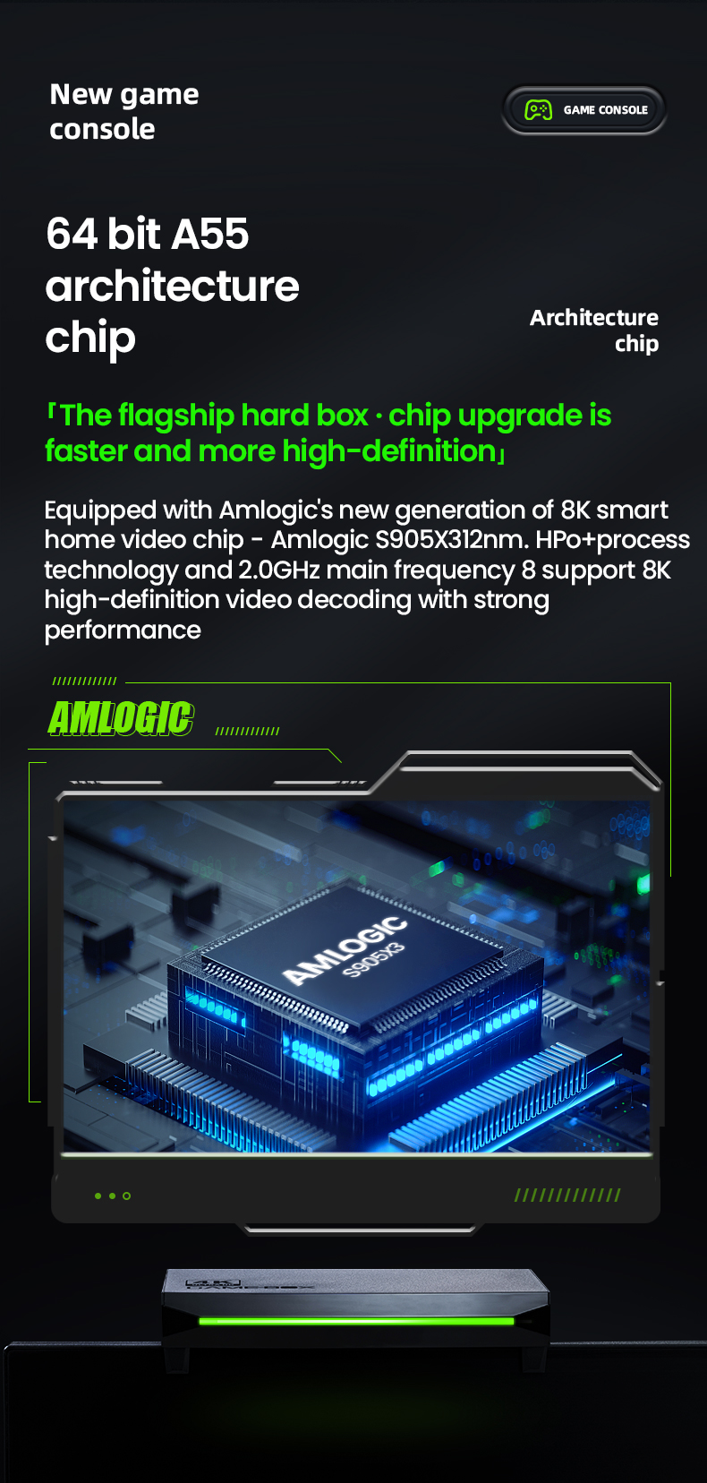 The H6 is powered by an Amlogic S905 X3 quad-core ARM Cortex-A55 CPU at 1.5GHz and includes 1GB DDR3 RAM. It supports multiple emulators and offers 64GB or 128GB internal storage with TF expansion up to 128GB.