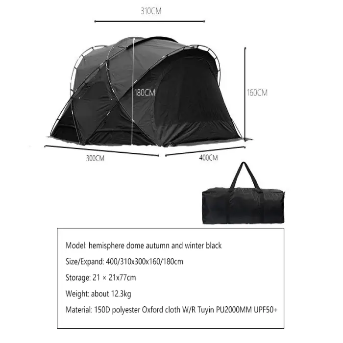 The Half Dome Canopy Tent has dimensions of 300 cm by 400 cm, providing a spacious area of 12 square meters.