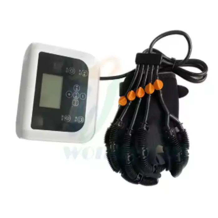 Fit the glove to the correct hand, secure straps, connect the power/USB cable, and select the therapy program per the user manual or therapist instructions. Begin with low intensity and short duration, increasing as recommended by your clinician.