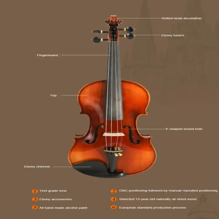 The violins typically come in a natural wood finish, offering a classic and elegant look.