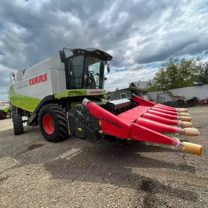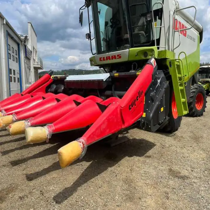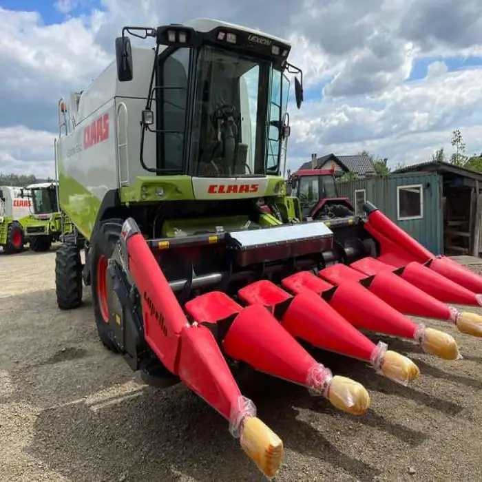 The combine harvester is manufactured by CLAAS, known for its quality agricultural machinery.