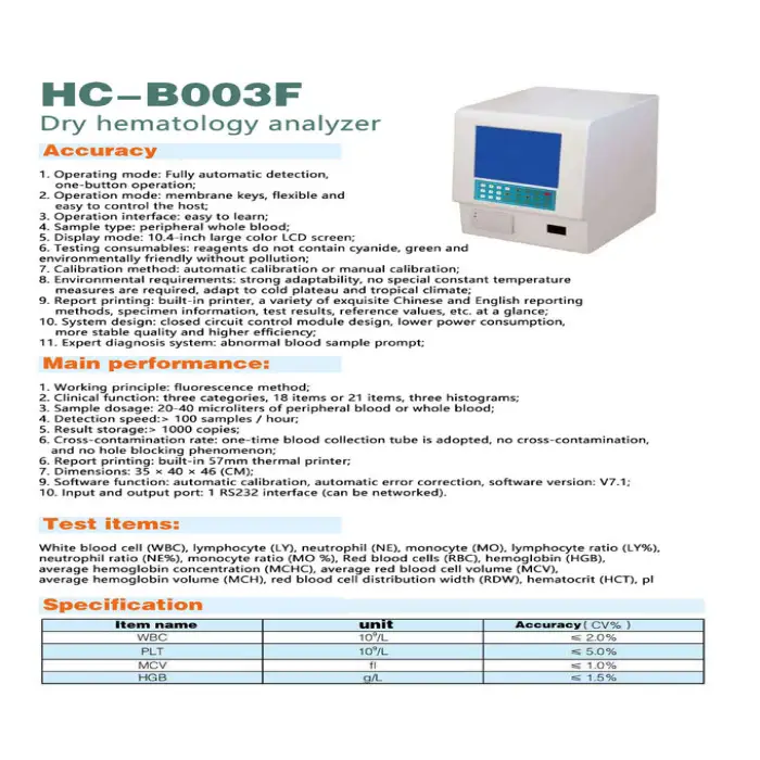 The HC-B003F Hematology Analyzer is designed for quick and accurate blood analysis, primarily used for complete blood count (CBC) tests in clinical laboratories.