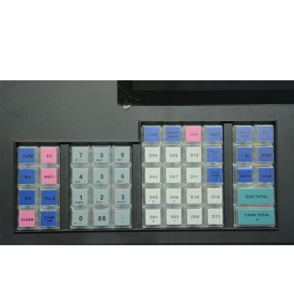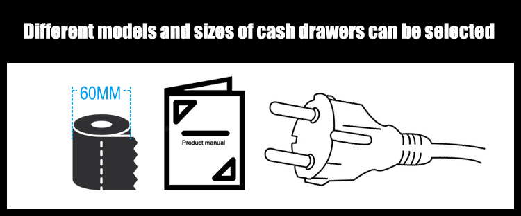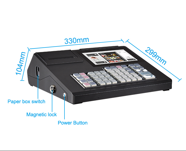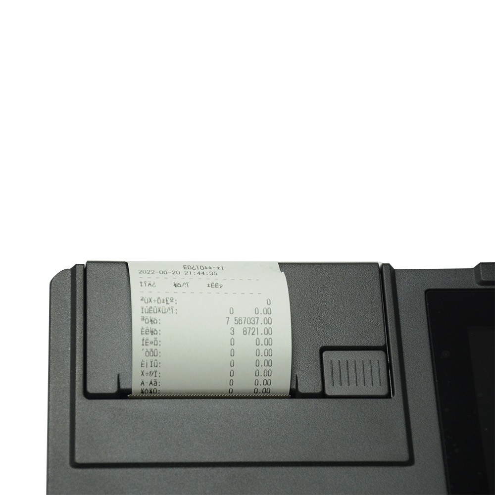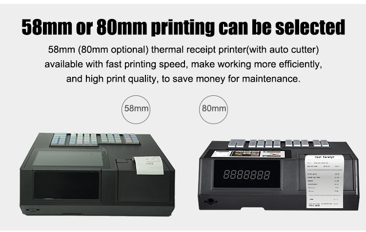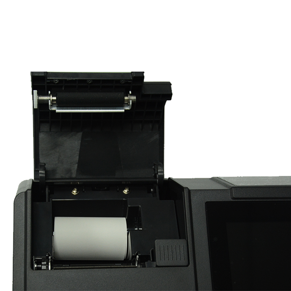 The system includes a built-in 80mm thermal printer with an auto-cutter. It requires standard 80mm thermal paper rolls.