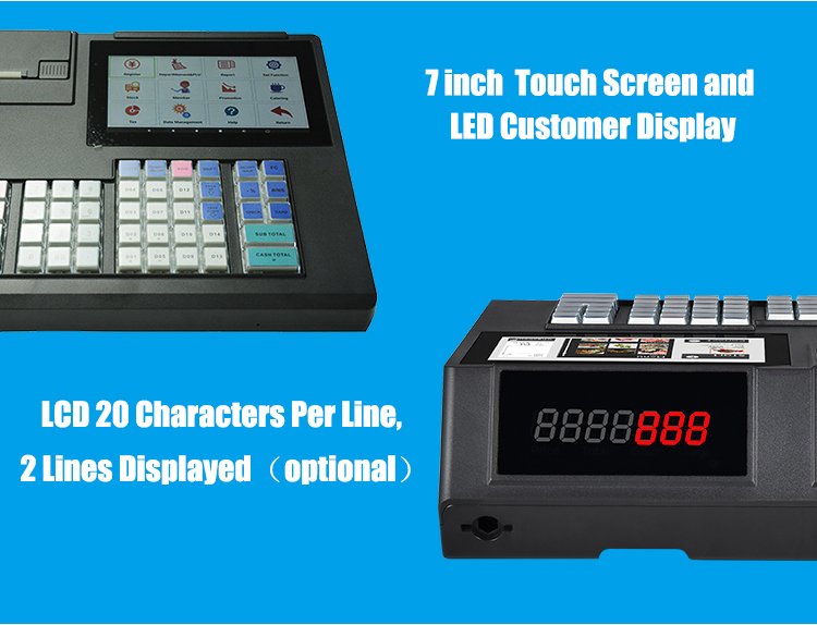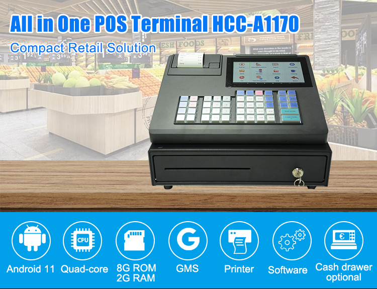 The HCCTG Android POS System is an all-in-one point-of-sale terminal running Android 11, built for modern retail and hospitality environments such as restaurants, cafés, boutiques and retail stores. It combines a 7" touch display, customer display, built-in 80mm thermal printer, and multiple I/O ports for peripherals and payments.