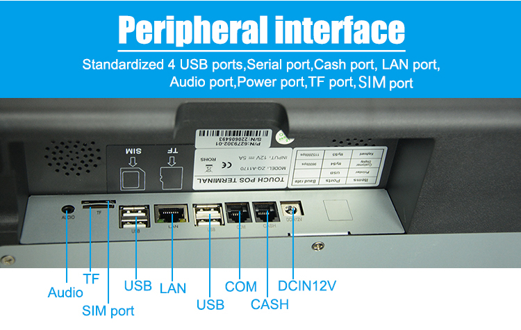 I/O includes 1 power button, 1 DC input, 1 cash drawer port, 1 COM port, 4 USB ports, 1 Ethernet network port (RJ45), 1 TF (microSD) card slot, optional SIM card slot (for cellular models), and a 3.5mm audio jack.