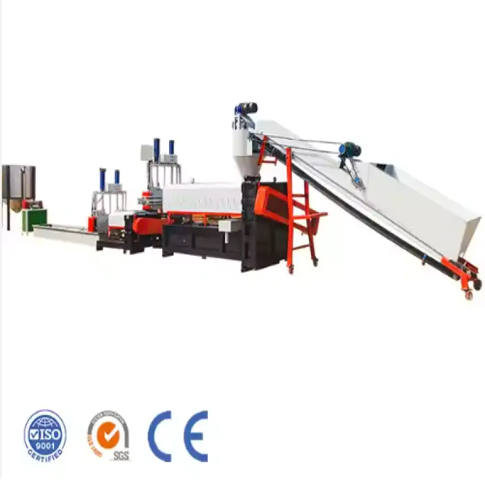 The machine is designed for granulating, pelletizing, and extruding plastic pellets from processed plastic flakes.