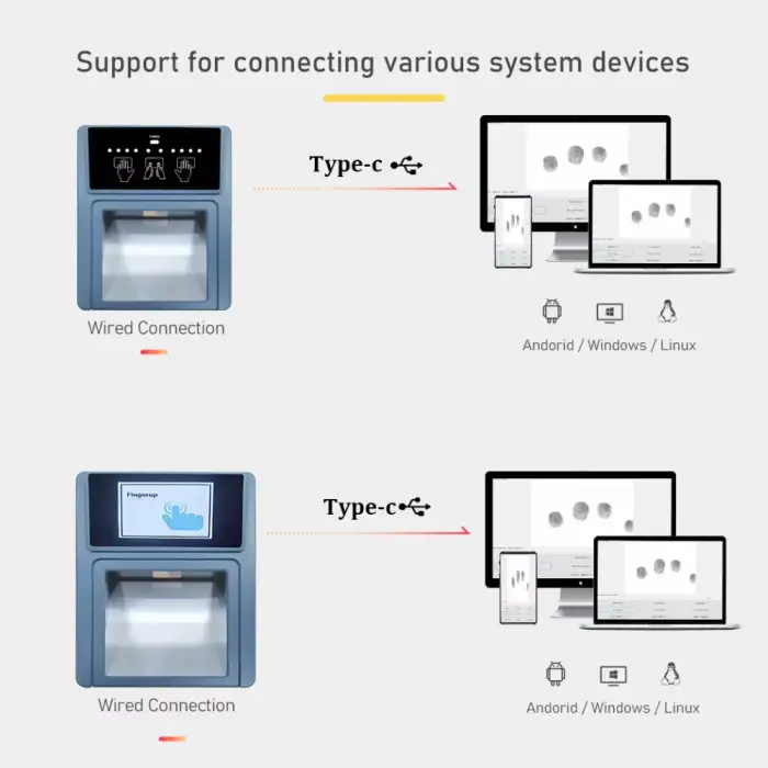 Yes — the device and SDK support ten-finger enrollment and verification workflows (i.e., enrolling and verifying all ten fingers). The unit does not physically scan all ten fingers simultaneously; the SDK manages sequential capture of each finger.