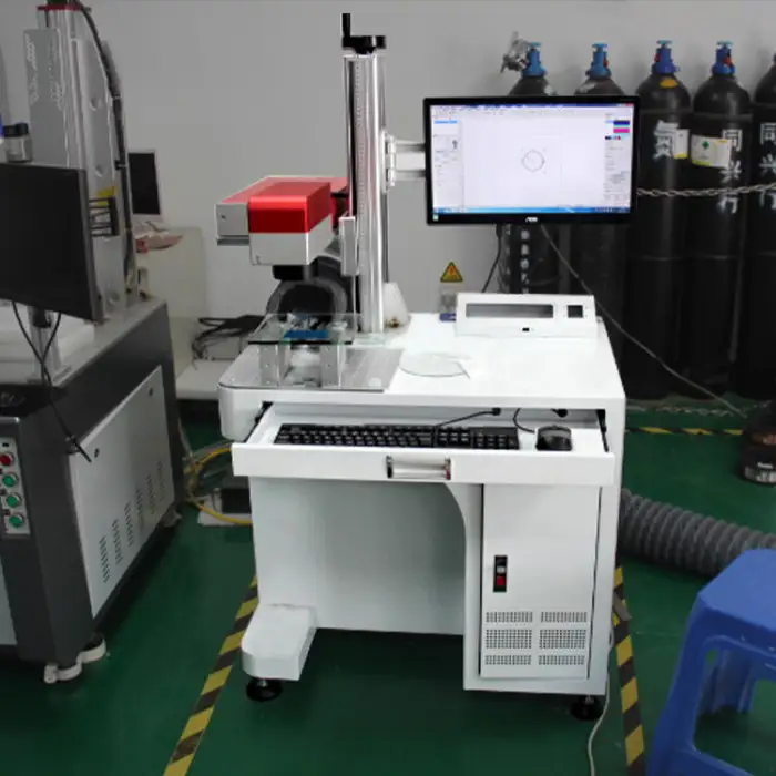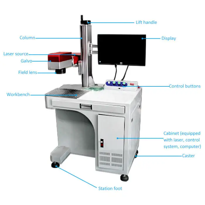 Key features include high accuracy, advanced CNC technology for smooth operation, efficient fiber laser source, bench-top design for space-saving, and an air-cooled system.