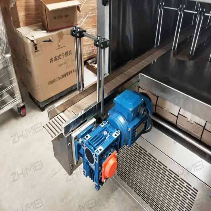 Regular maintenance includes cleaning and sanitizing the conveyor and contact surfaces, inspecting and lubricating motors/gears, checking belts and seals for wear, monitoring refrigeration system performance and refrigerant levels, and following any manufacturer-recommended service intervals.