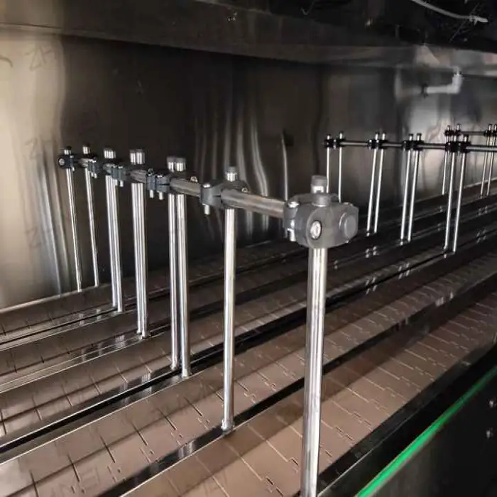 Typical safety features include emergency stop buttons, guards around moving parts, PLC alarms for fault conditions and safe electrical protection. Operators should be trained on safe operation and lockout/tagout procedures for maintenance.