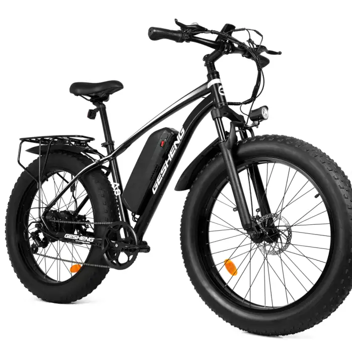 The e-bike features a front suspension system for enhanced comfort and handling on bumpy trails.