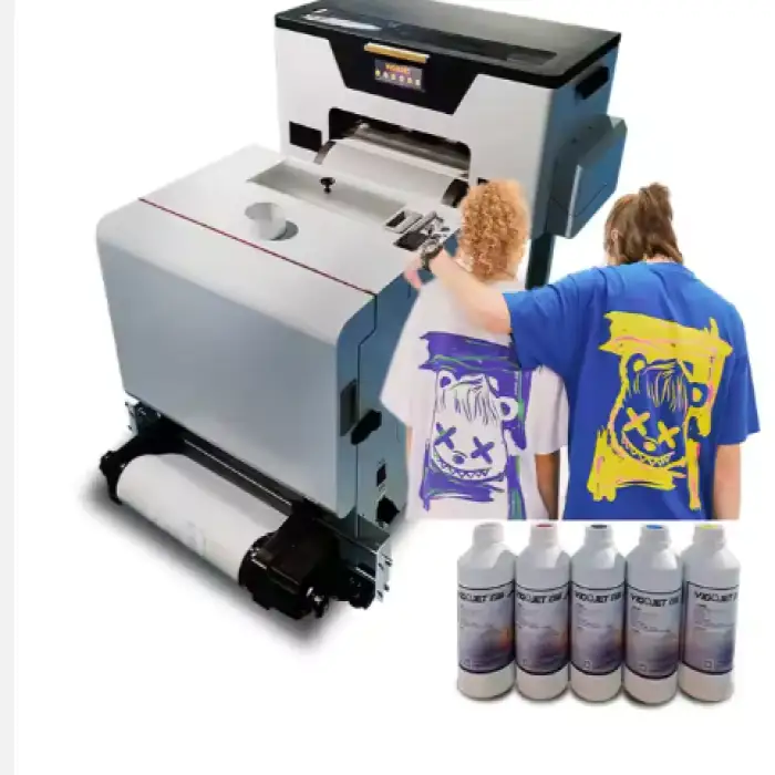 The printer uses advanced pigment ink technology, which ensures vibrant and long-lasting colors on garments and other materials.