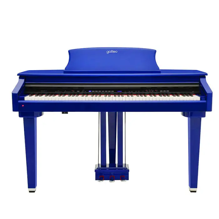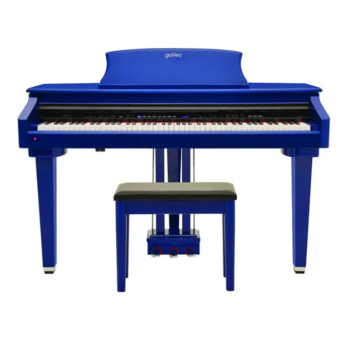 The High-gloss Blue Mini-grand Piano has a polyphony of 128 notes, allowing for rich and complex sound.