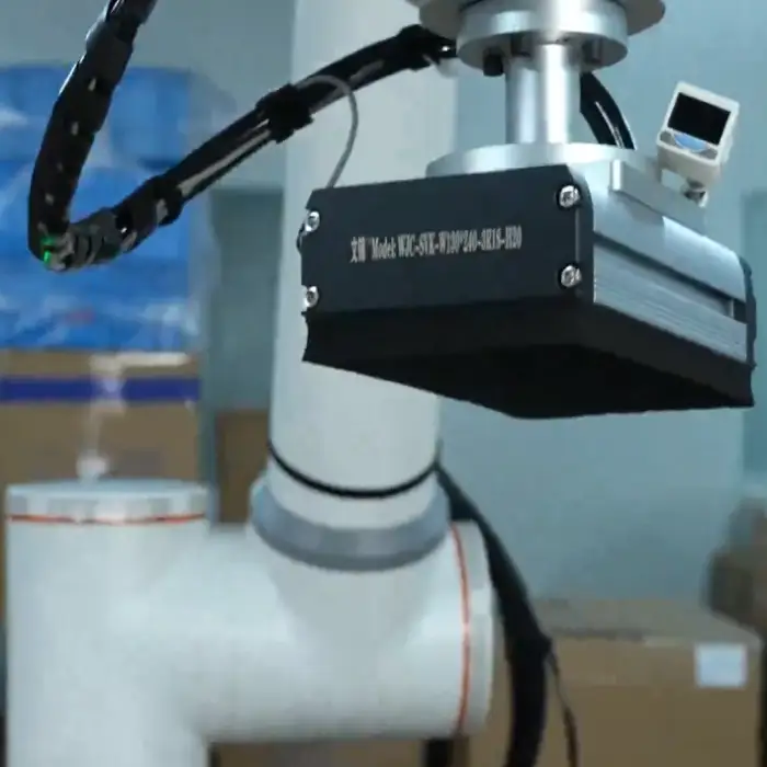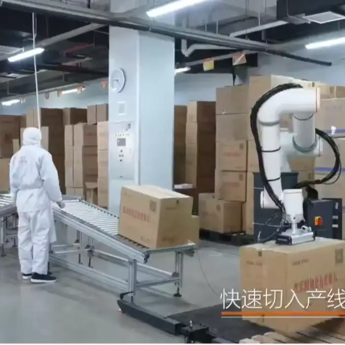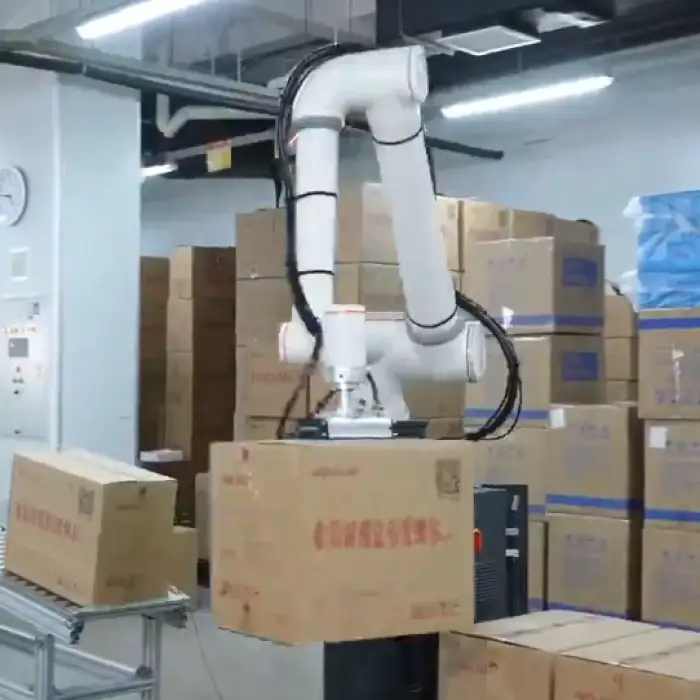 The robotic arm is suitable for handling various types of boxes and materials commonly used in logistics, distribution, and manufacturing settings.