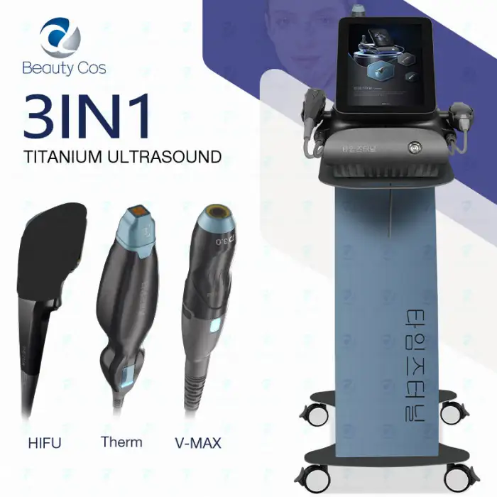 Key features include advanced HIFU technology, multiple cartridge depths for customized treatments, a touch screen display, lightweight design, and three handles for various applications.