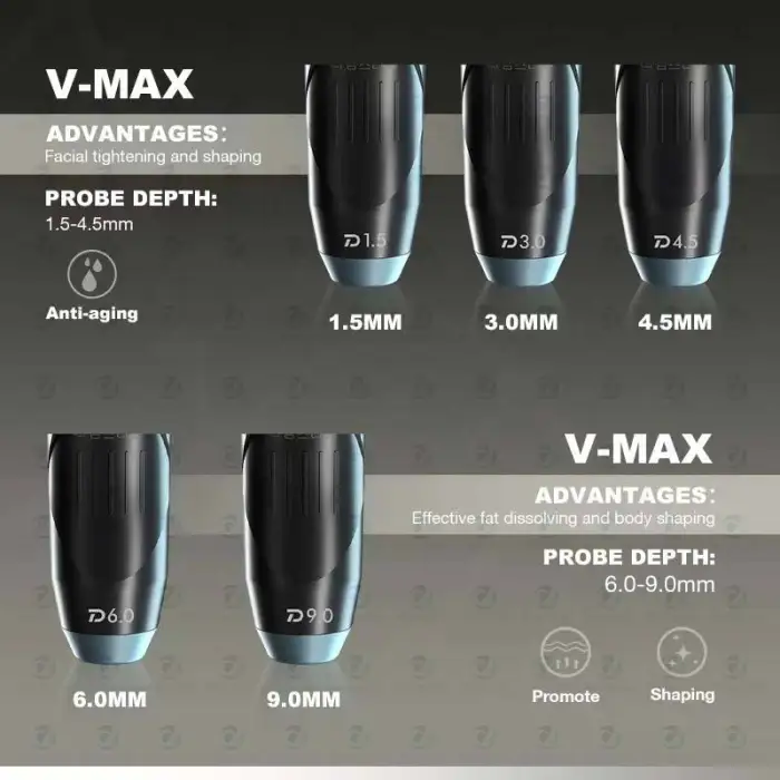 The High-Tech 50D MAX uses High-Intensity Focused Ultrasound (HIFU) technology to penetrate the skin at various depths, promoting collagen production and tightening the skin.