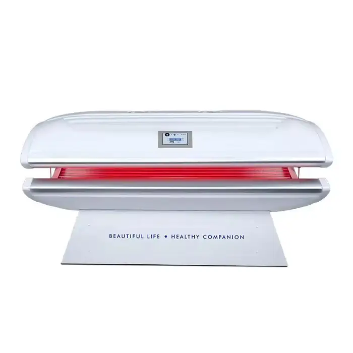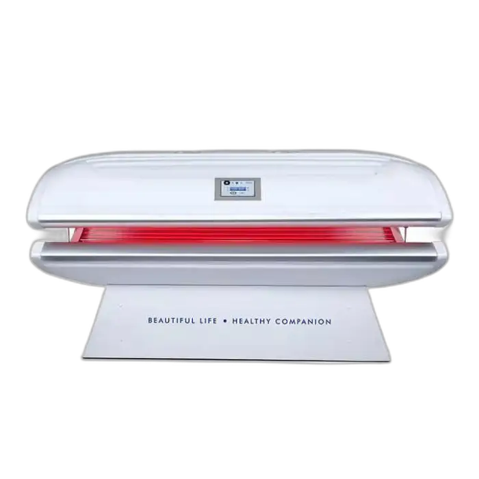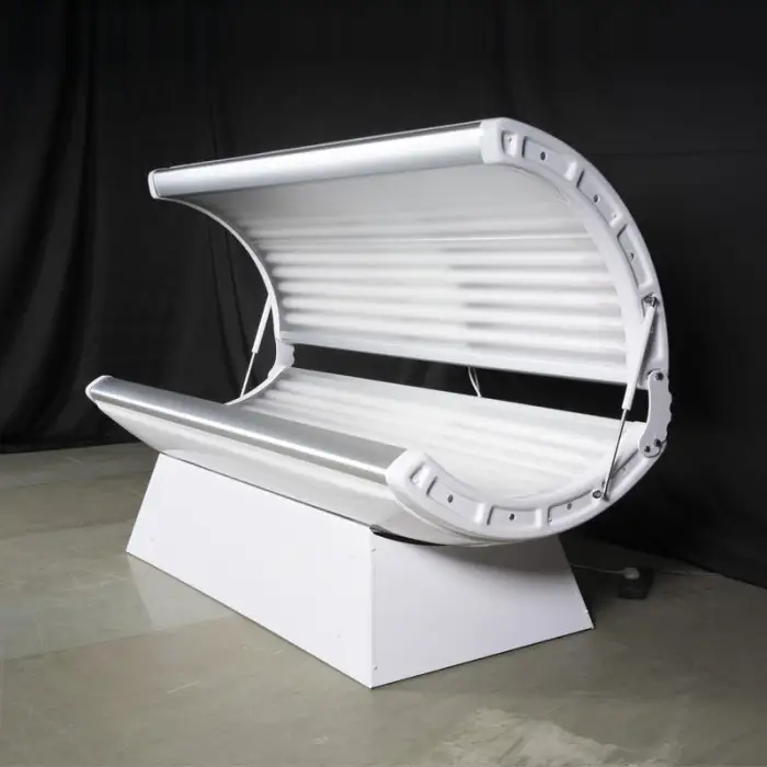 It is a lying-format tanning bed designed for both home and commercial use that combines tanning UV lamps with modes aimed at skin rejuvenation and collagen stimulation. It is built for full-body treatments and includes features for skin tightening, acne treatment, and relaxation.