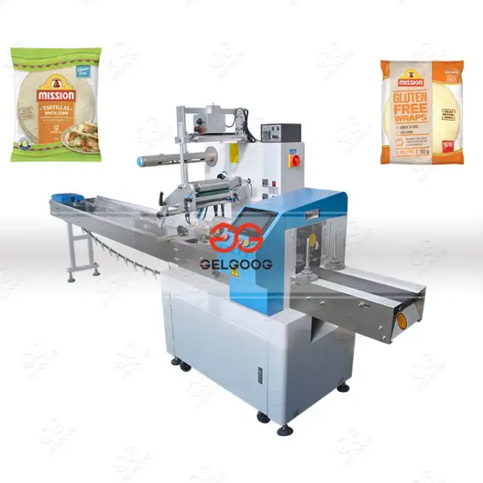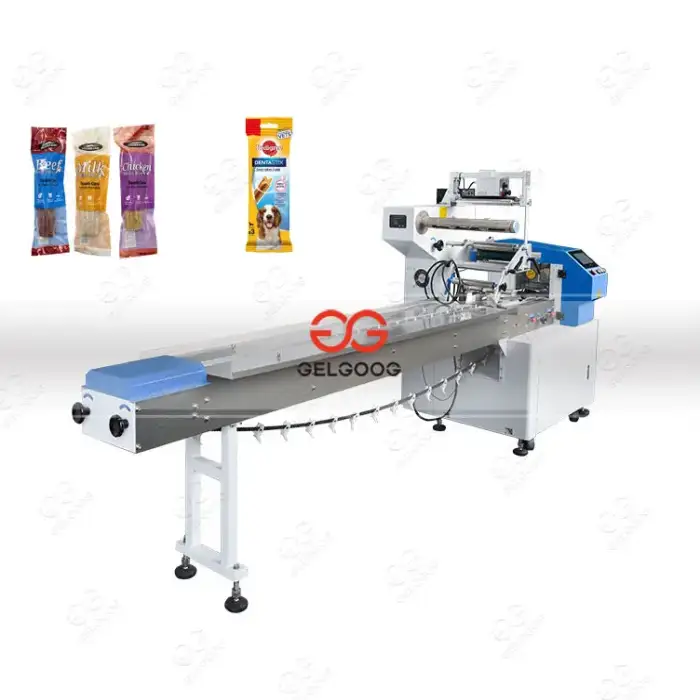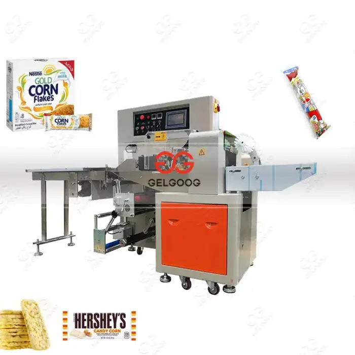 The machine is designed to package a variety of products, including corn bars, mini cakes, snacks, and other small food items.