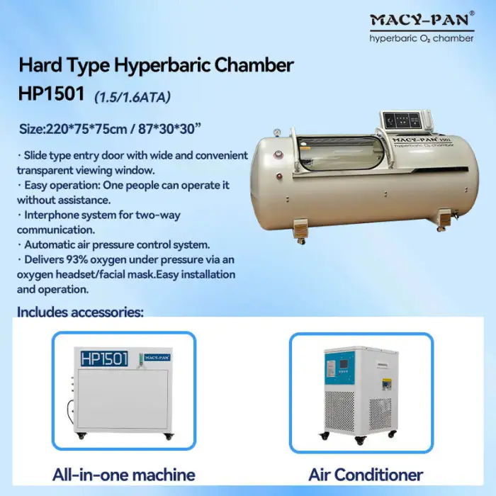 The HP1501 operates at a pressure of 1.5ATA, which is equivalent to 7Psi, providing an optimal environment for oxygen therapy.