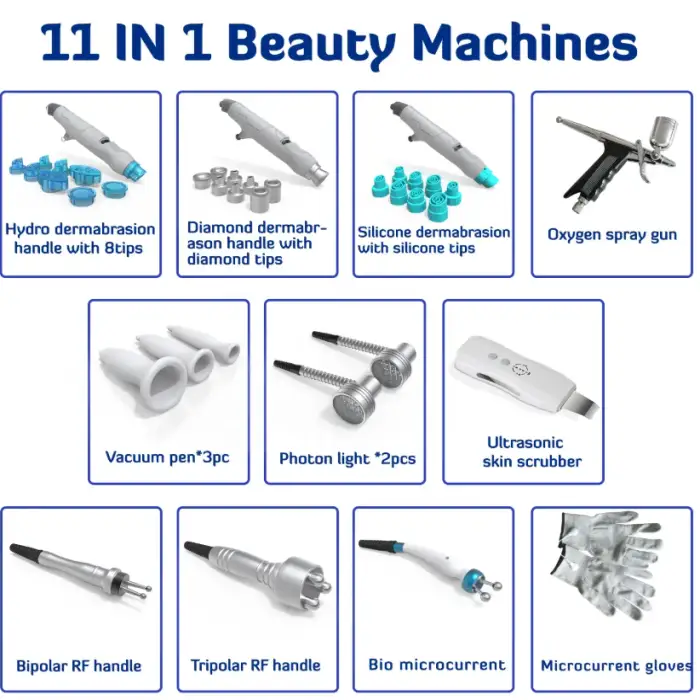 The machine comes with 11 different handpieces, each designed for specific treatments targeting various areas of the face and neck, allowing professionals to customize their services based on individual client needs.