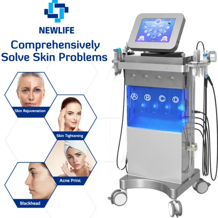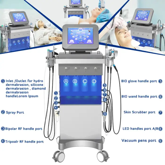 The machine utilizes several advanced technologies, including hydro dermabrasion, diamond dermabrasion, silicone dermabrasion, bio microcurrent, vacuum pens, oxygen water spray, bipolar RF, tripolar RF, ultrasonic skin scrubber, and LED therapy.