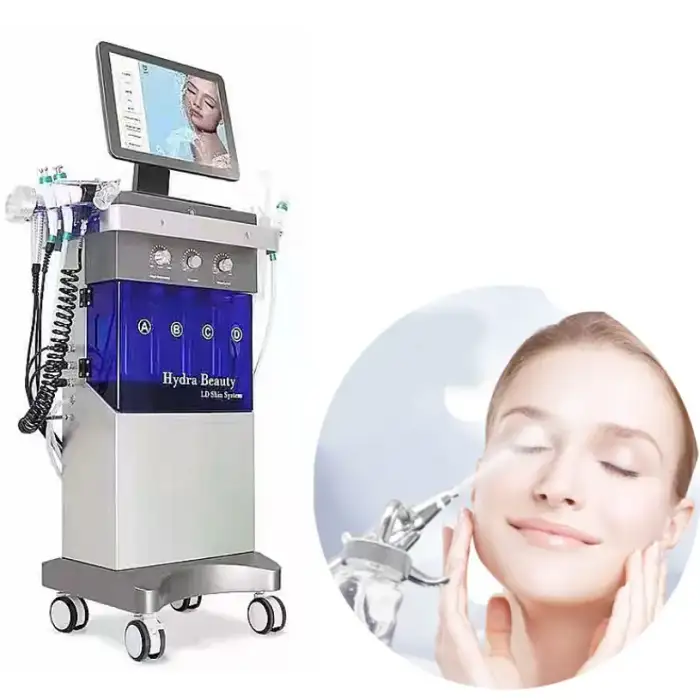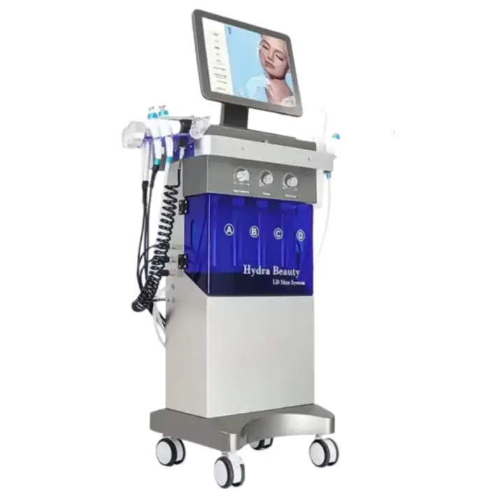 The machine is designed for deep skin cleansing and rejuvenation, utilizing hydro dermabrasion, PDT, ultrasound, and spray mist technologies to improve skin texture, reduce wrinkles, and enhance overall skin appearance.