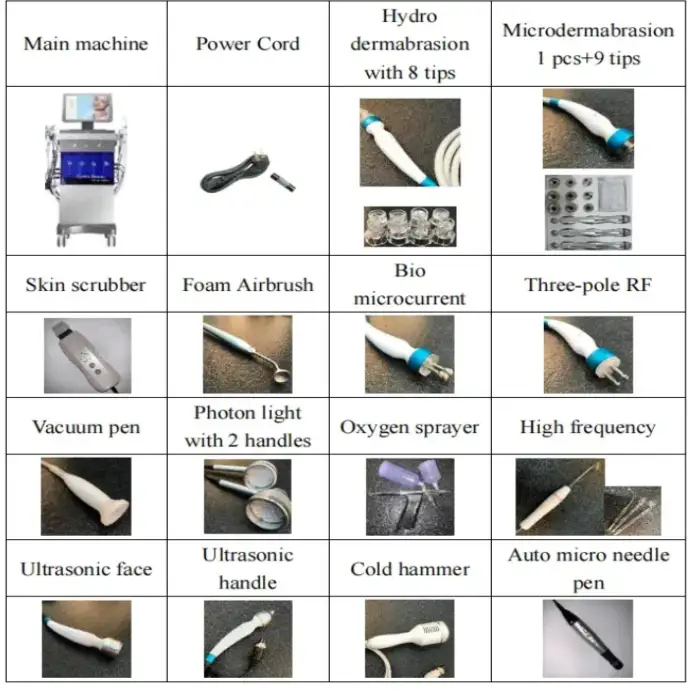 The machine includes 14 interchangeable handles, allowing for versatile treatments tailored to different areas of the face and skin types.