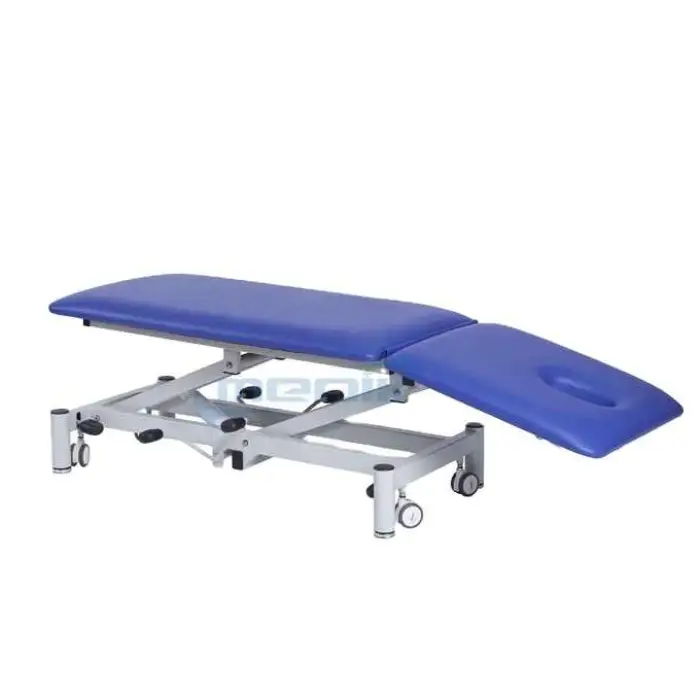 The bed features a sturdy metal construction and a hydraulic system designed for long-term use. With a 225 kg load capacity and lockable wheels, it is intended to provide stable, durable support in clinical settings.