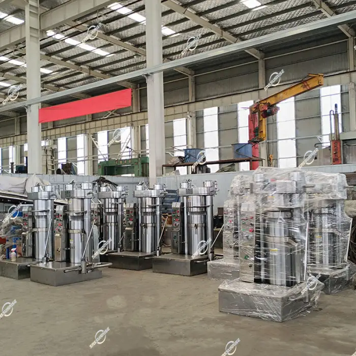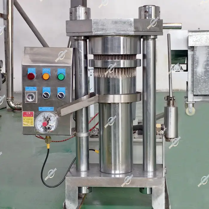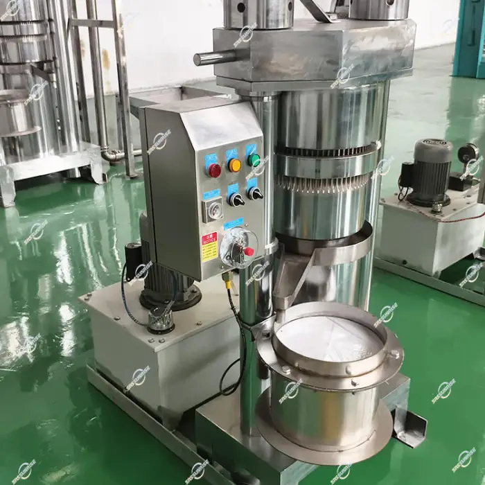 The machine operates at a hydraulic pressure of 60 Mpa, which helps ensure maximum oil yield from the raw materials.