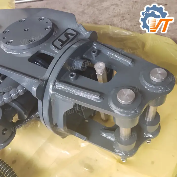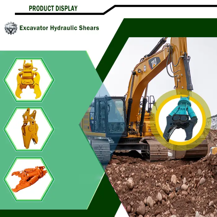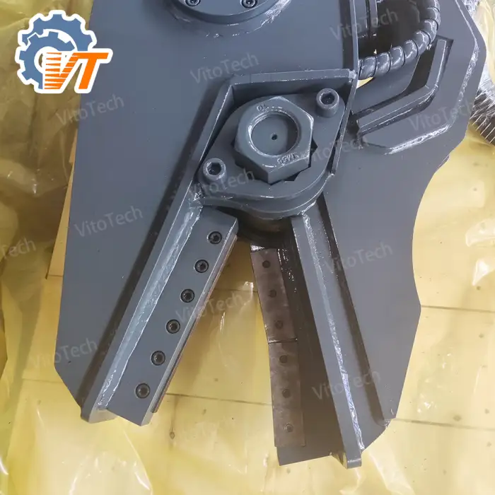 The hydraulic actuation allows for powerful and efficient cutting through scrap metal, utilizing the hydraulic system of the excavator.