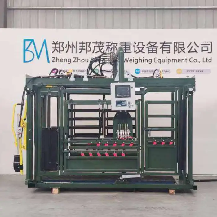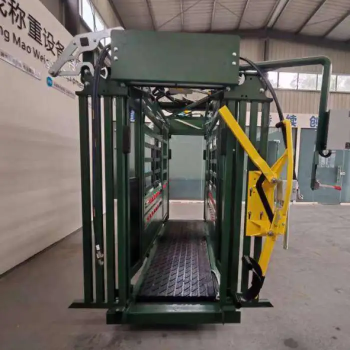 The equipment includes a sturdy frame design and a secure holding mechanism to ensure both cattle and handlers are safe during operations.