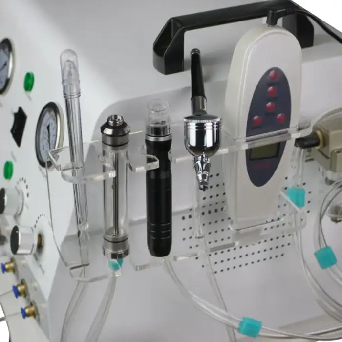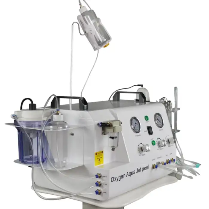 The main function of the machine is to provide a comprehensive facial treatment using five advanced technologies: diamond microdermabrasion, hydro aqua face cleaning, oxygen jet peel, ultrasonic skin scrubbing, and oxygen spray.