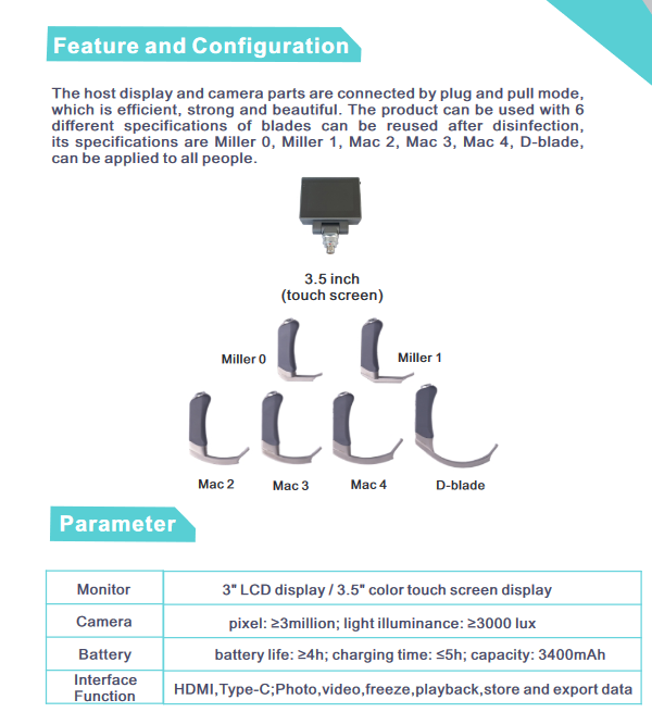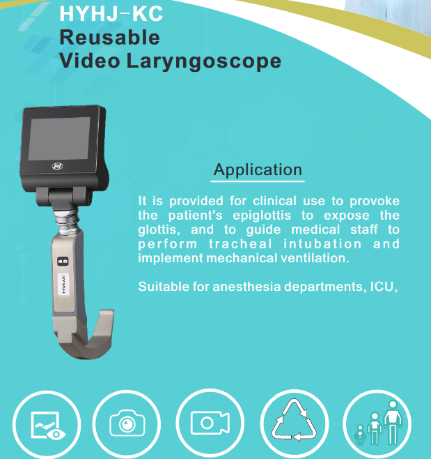 The HYHJ-KC Reusable Video Laryngoscope is designed for intubation procedures, providing a clear video feed for better visualization of the airway.