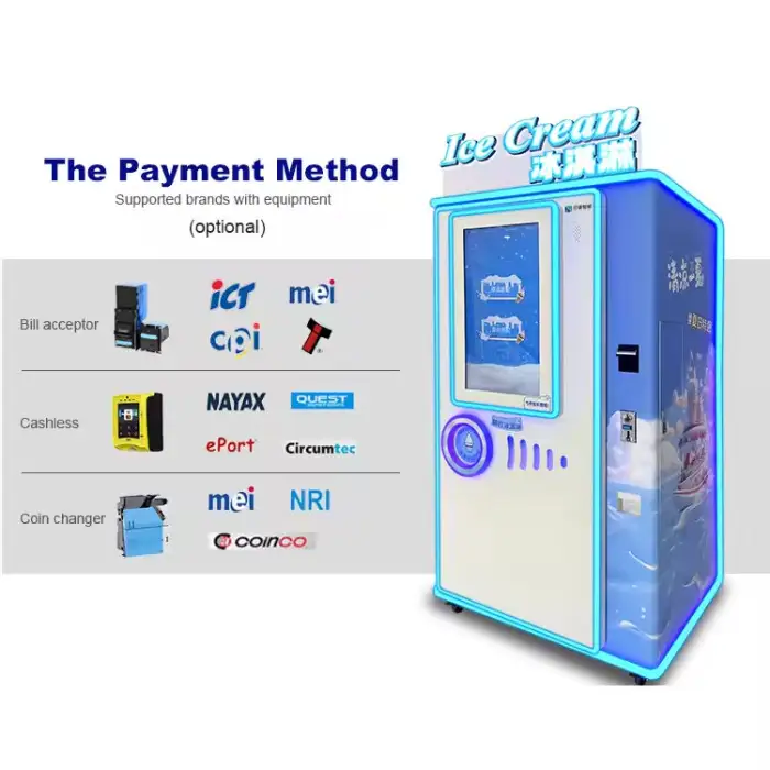 The Cool Treats in Seconds Ice Cream Vending Machine supports multiple payment options including coins, bills, and credit cards for your convenience.