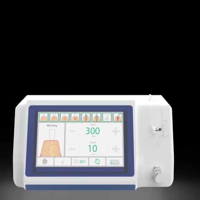 The unit includes a standard 20:1 contra-angle with LED, as well as other ratios: 16:1, 27:1, 1:1, 1:2, 1:3, and 1:5 to accommodate various surgical instruments.