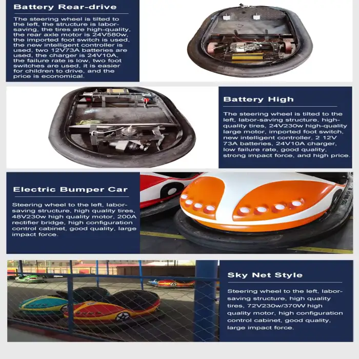 The bumper cars are constructed from durable fiberglass and steel, ensuring safety and longevity.