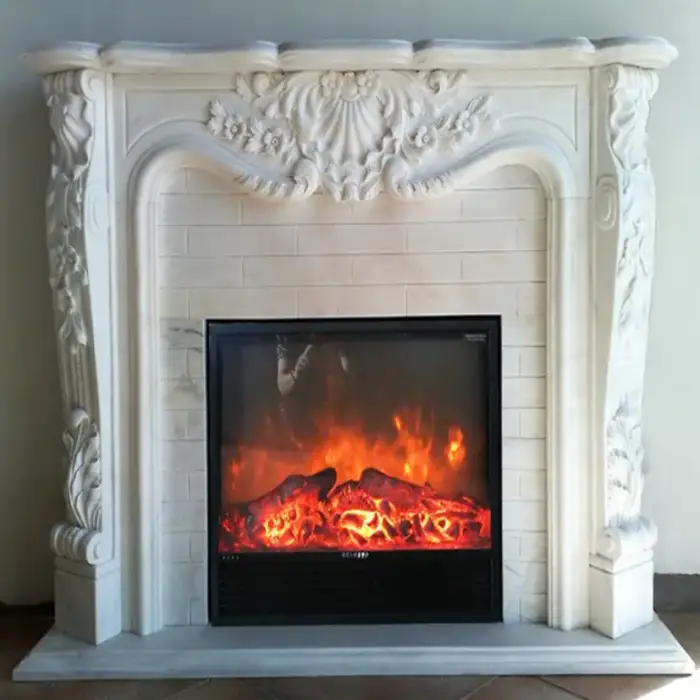 The fireplace is made from high-grade marble, granite, micro marble, and sandstone, providing a durable and elegant finish.